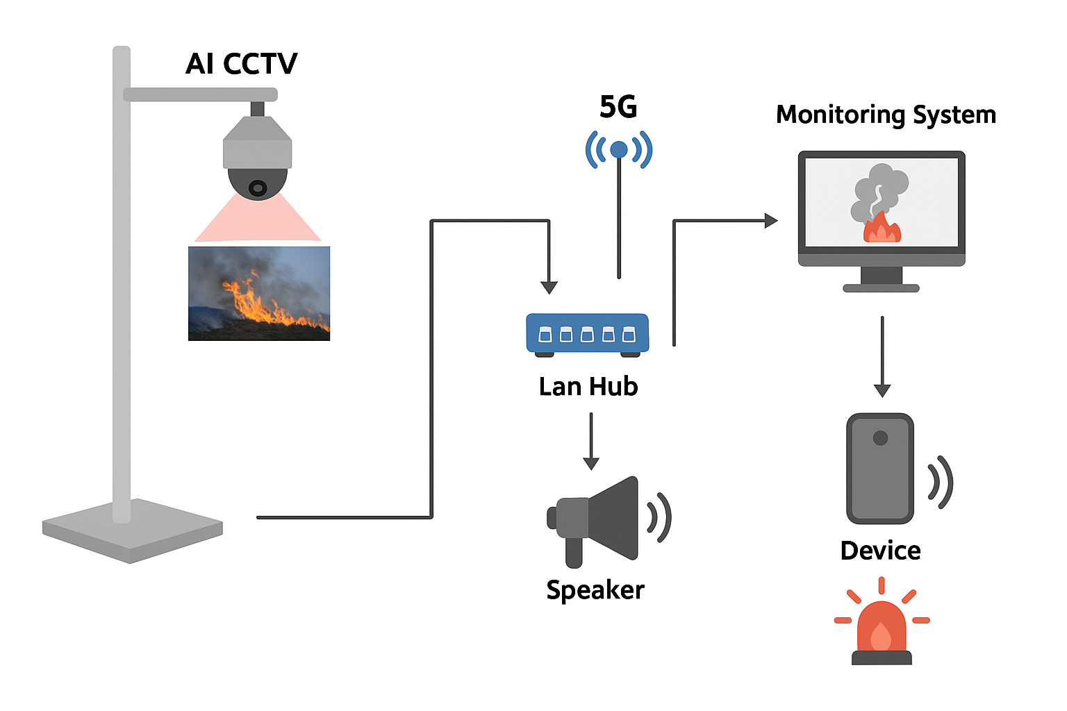 CCTV에서 연기, 불꽃, 입산객 등을 감지하여 이를 저장하고 실시간 데이터를 전송하며, 이상 징후 발생 시 관리자는 물론 지정된 마을 장 등에게 실시간 정보전달을 통해 미리 예방할 수 있습니다.